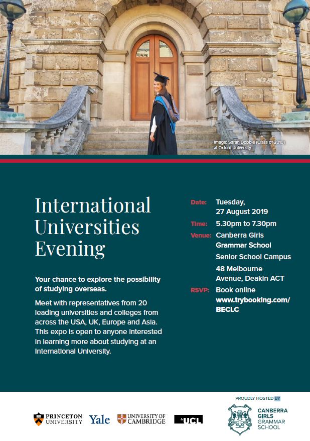 Date: Tuesday, 27 August 2019 Time: 5.30 pm Venue: Canberra Girls Grammar School