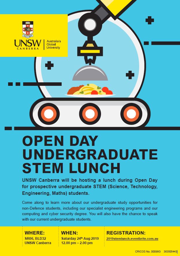 UNSW at ADFA – Open Day is fast approaching and we would like to take this opportunity to remind you that places are still available for a STEM Lunch for future undergraduate students interested in STEM studies as a non-Defence civilian student. The lunch will be held during the ADFA Open Day on Sat 24 August 2019.
