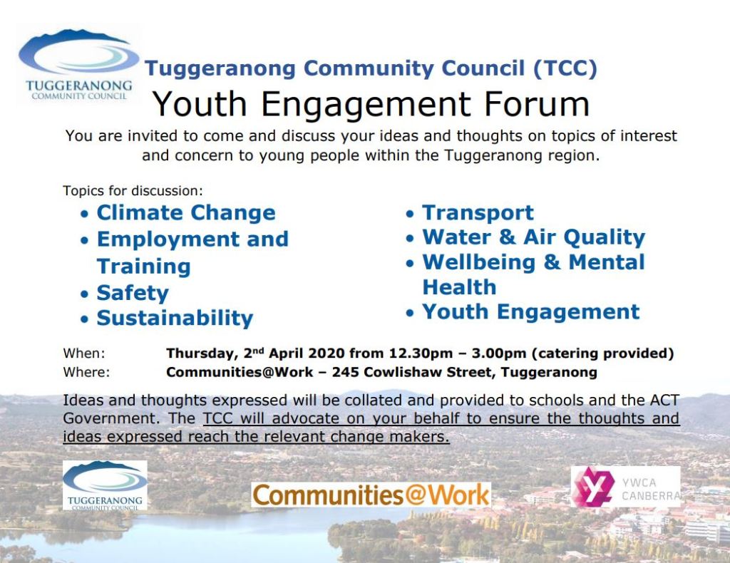 The Tuggeranong Community Council is providing an opportunity for young people to contribute to a Youth Engagement Forum. With the details below the forum works well and comes at the same time that the student voice is also developing through the Lake Tuggeranong College recycling group within the College.