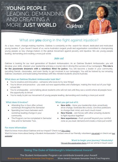 My name is Arielle Blokker and I am an ACT Community Engagement Officer at Oaktree. Oaktree is Australia’s largest youth-led not-for-profit international development organisation, committed to championing young people as key social and political change-makers. As well as funding education and leadership programs overseas, we build the capacity and influence of young people in Australia. Our Student Ambassador Program transforms hundreds of young Australians into agents of change, empowering them to advocate for a more just world and youth participation in decision-making. I’m reaching out today to offer students at Lake Tuggeranong College the chance to participate in this program.