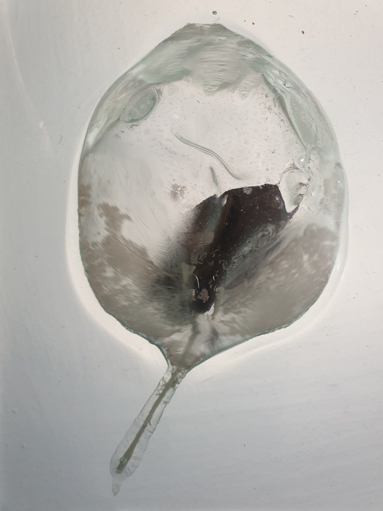 This wonderful piece of kiln formed glass has been created by Lake Tuggeranong College student Eli Williams as part of his assignment the “Cabinet of Curiousities”. Eli assembled two pieces of ordinary glass, like that found in a window and he placed a large dry leaf which has formed a bubble when fired at 820 degrees Celsius. If you look carefully you can see the remains of the leaf trapped forever inside the glass. The glass inclusion will form the basis of Eli’s investigative drawing in his Visual Diary.