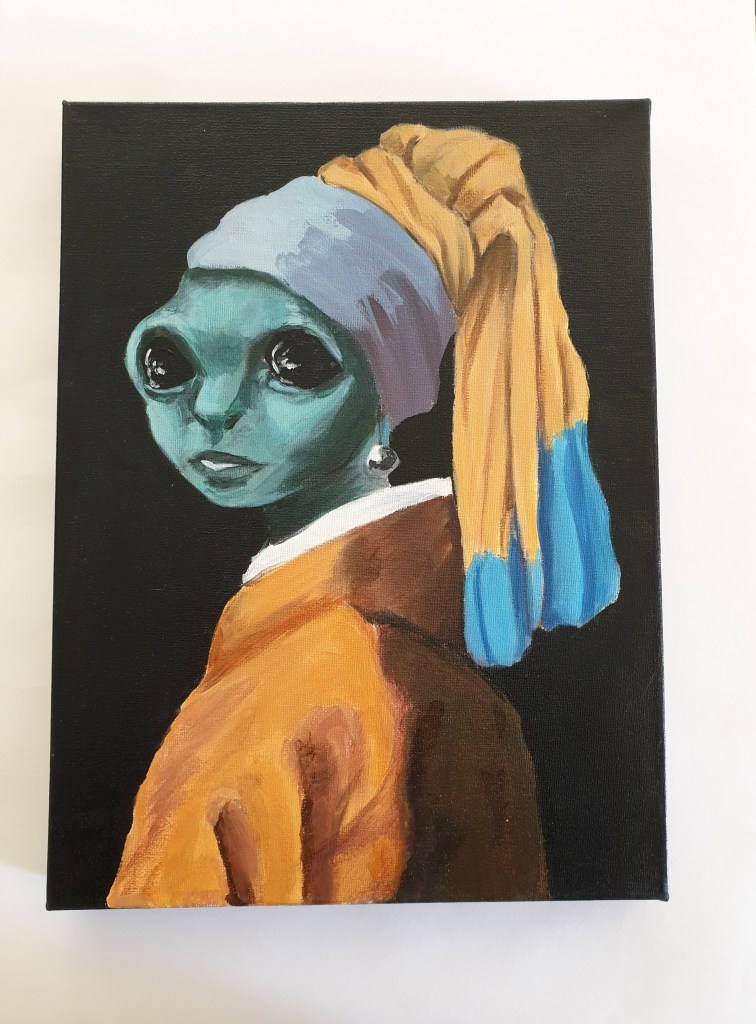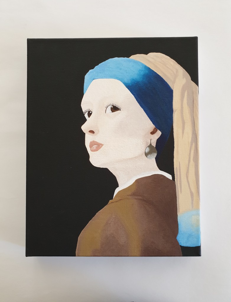 New paintings by our art students plays with the idea of gaining inspiration from earlier artists. The art students have explored Vermeer’s painting from 1665, Girl with a Pearl Earring. This is Vermeer’s most famous painting although it is not a portrait because it is a painting of an imaginary figure. When artists’ paint an imaginary figure it is called a “Tronie”.