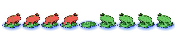 Frogs and Lilypad’s puzzle (red frogs can only move to the right, green frogs can only move to the left. A frog can only jump to an adjacent vacant lilypad or jump over one frog of a different colour to a vacant lilypad. There is a mathematical relationship between the number of frogs of one colour and the minimum number of moves)