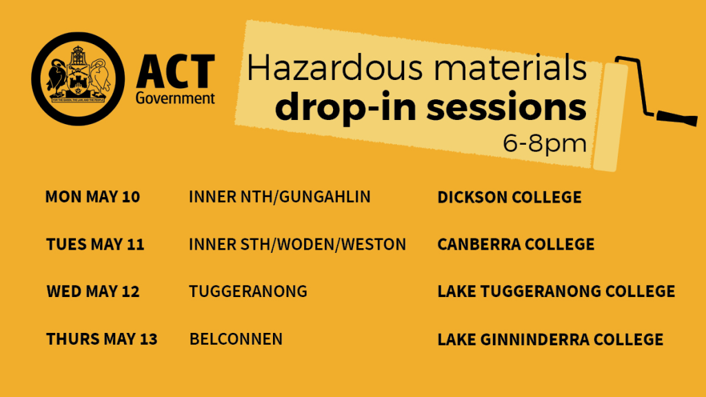 A drop-in session will be held at Lake Tuggeranong College next Wednesday for the public to learn more about hazardous materials management in ACT public schools.