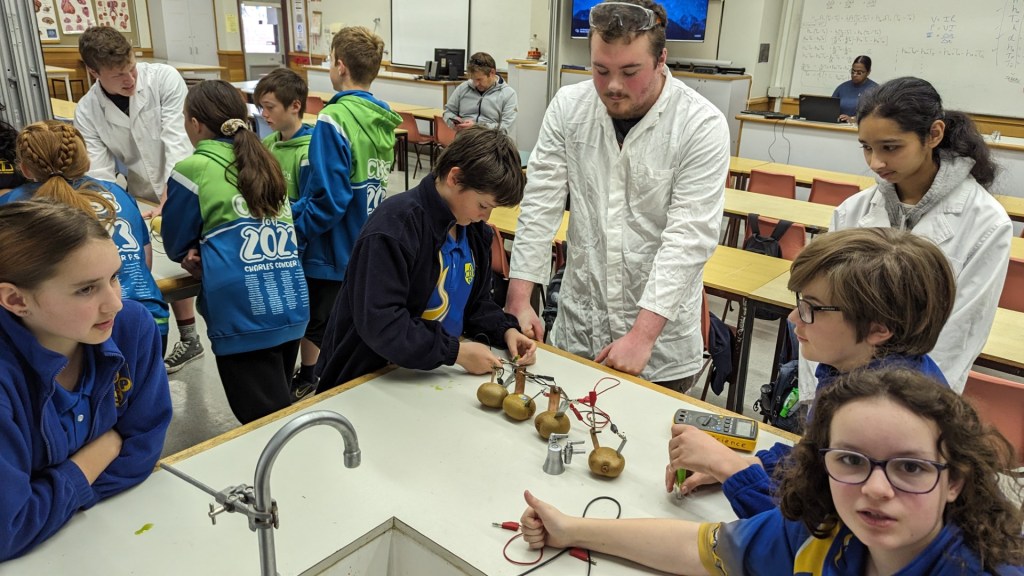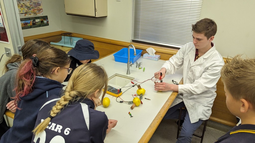 Wrapping up the week, Yr 12 Physics and Chemistry students collaborated with 22 Yr 6 students from local feeder schools. Together, they built fruit batteries, tested wind turbine blade designs, and navigated drones through health service obstacles.
