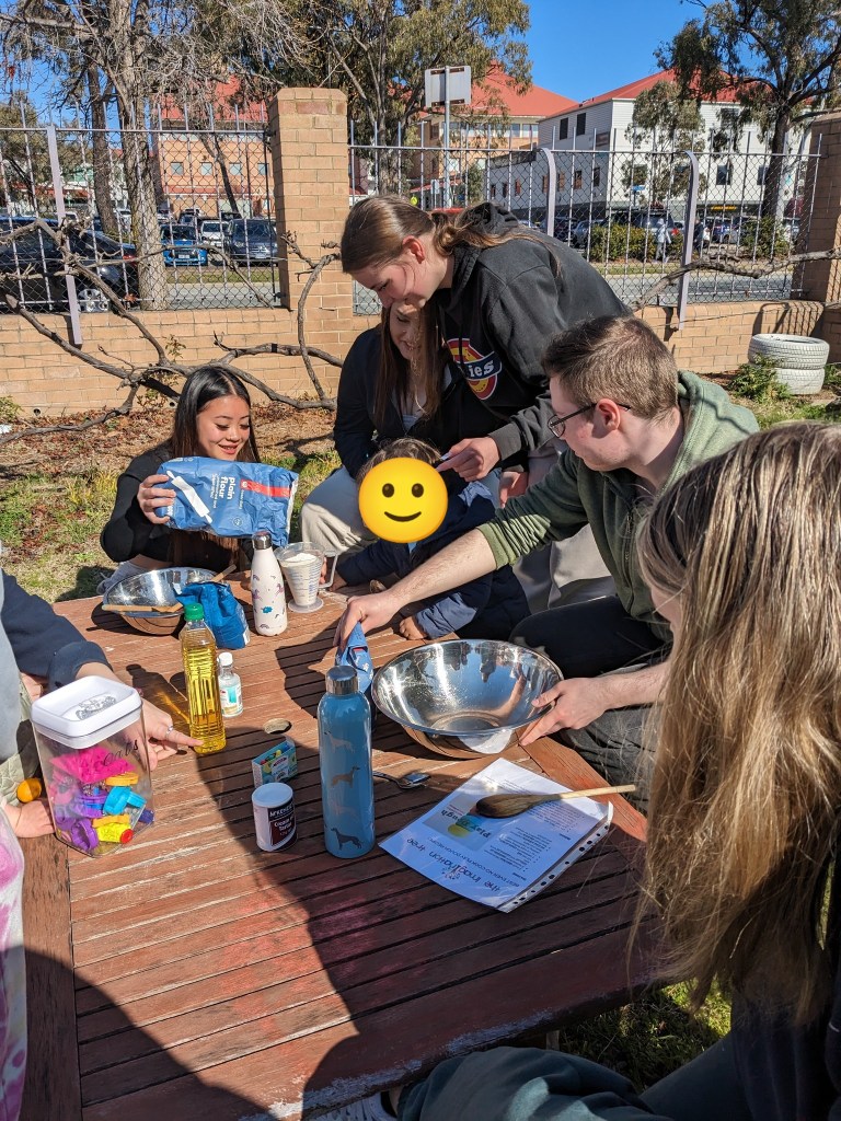 Tash ran a fun activity, experimenting with chalk colours; whilst Max, Sophie, Bronte, and Numpreem helped some of the pre-schoolers measure, pour, and mix homemade playdough.
