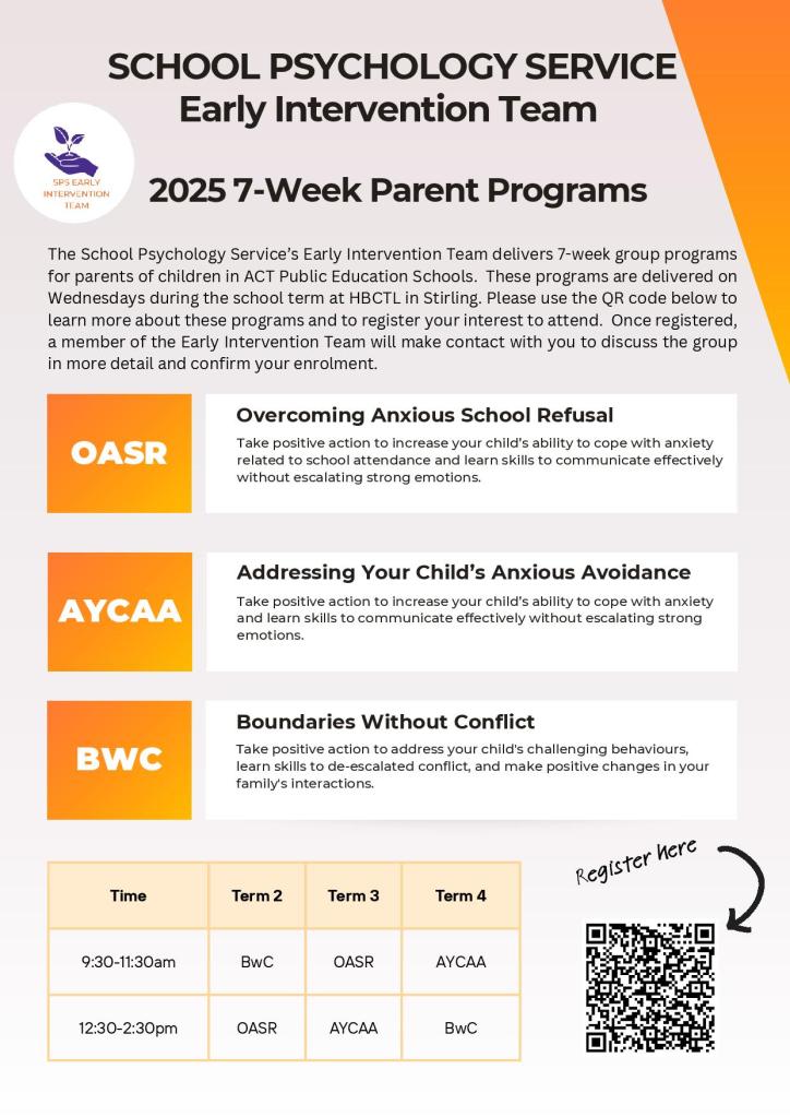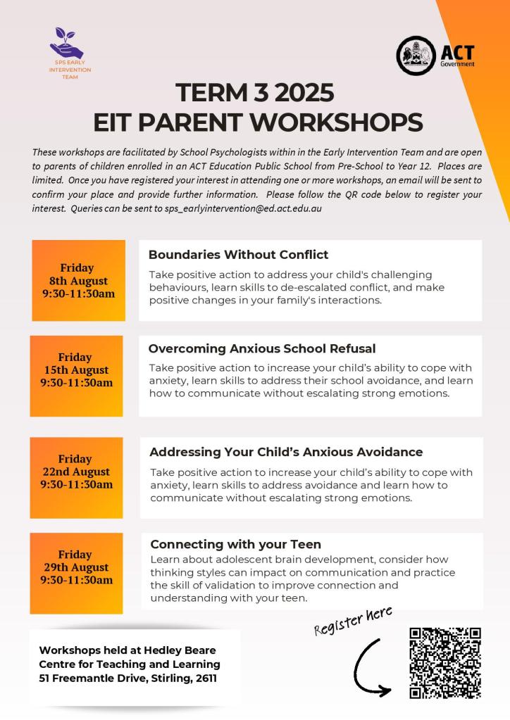 The School Psychology Service’s Early Intervention Team is running free parent groups and workshops to help families. These are for parents and carers of students in ACT public schools (preschool to year 12).